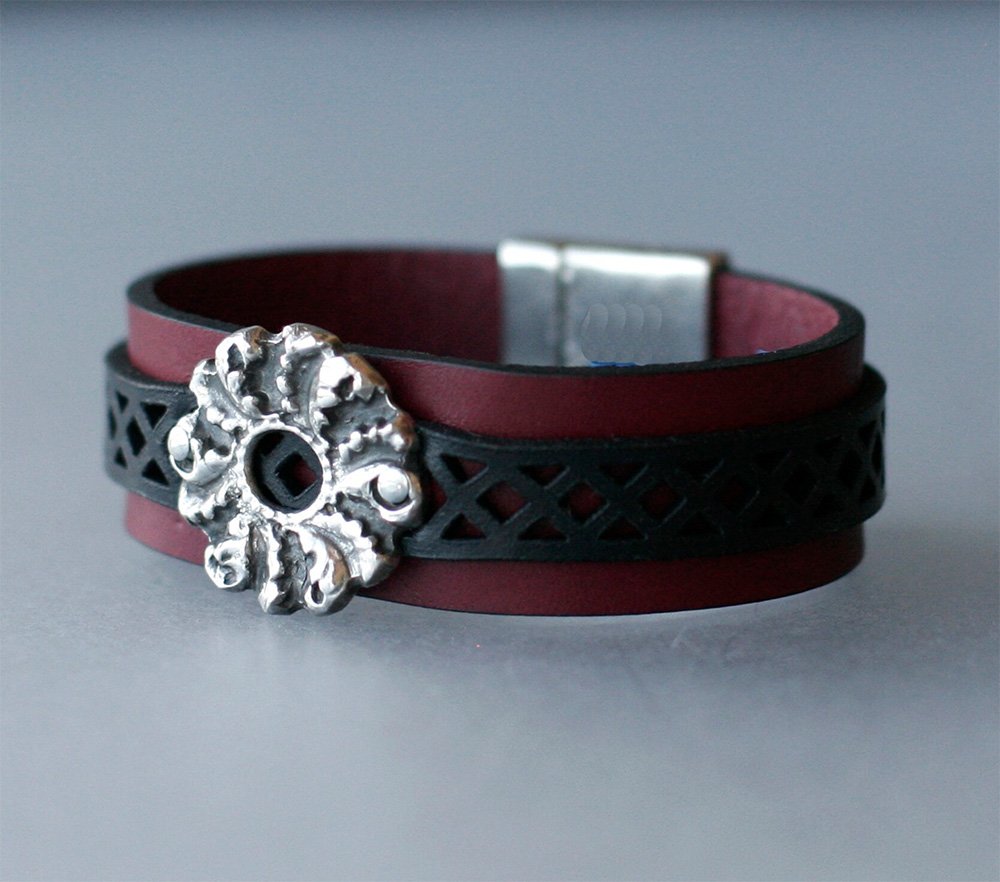 Basse-Taille describes semi-transparent enamel over embossed patterned copper. Embossed pattern is enhanced with black underglaze then multiple layers of semi-transparent enamel are applied and fired so that the pattern can be seen beneath the enamel. This labor intensive process created enamel components with great warmth and depth of color. Each piece is completely individual as the colors after firing vary slightly based on specific conditions. All links and components to complete the jewelry piece are sterling silver.