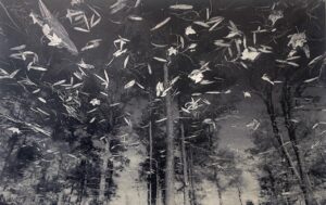 My studio process has evolved since university days cutting, painting, and recombining images. I reverse print on clear panels, painting in layers behind the image to provide light refractions that shift slightly as the viewer moves. The surfaces are hand-sanded, adding yet another layer. The process was inspired by Romanian glass painting painted in reverse (I’m half- Romanian).