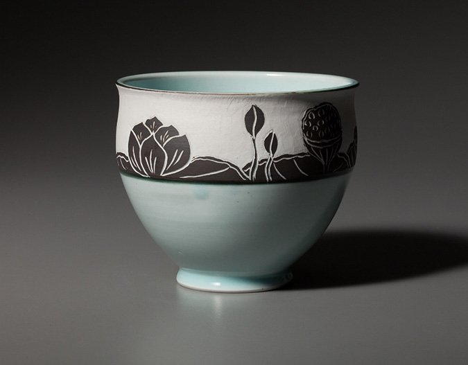 Objects used and handled during everyday routines become familiar and comfortable. Functional tableware is an integral part of the routine and pottery can serve a warm and welcoming part. My work begins on the porter’s wheel. Porcelain is my first choice for a clay body. It has a silky touch while being turned and can be finished to the softest, smoothest surface. Texture is then achieved with various ribs, carving tools , hand made stamps or found objects. The work is then bisque fired to make it strong enough to handle and glaze. Once the glaze is applied and decoration is complete, the ware is fired a second time in either a soda or gas kiln using a reduction atmosphere. Japanese Shino and Celadon glazes are used on most of my tableware. The whiteness of the clay body allows the glaze colors to shine. the Sometimes subtle and sometimes dramatic variations in these glazes make each individual piece unique.