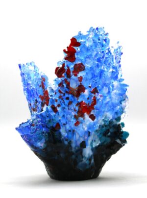The sculptures in my Crystalline series are inspired by geodes and gemstones, combining the properties natural stones and crystals with the brilliance of refined, polished jewels. Each one is crafted with glass cut from large sheets that I hand crush and sift into tiny fragments. The fragments are then tediously layered in varying densities to create the sculpture’s granular texture while blending colors, shaping, and free-forming the composition as I go. Many of these works feature open areas within the design where I’ve allocated space for the glass to stretch, drip, or hollow-out as it becomes molten while still holding to its planned configuration. Creating these geode-like ‘cavities’ is a meticulous process. My intentionally imbalanced areas have to be perfectly balanced within the overall design for the sculpture to successfully take its shape and avoid collapse while firing. The weight and distribution of layers have to be precise; it’s a delicate process of give-and-take.