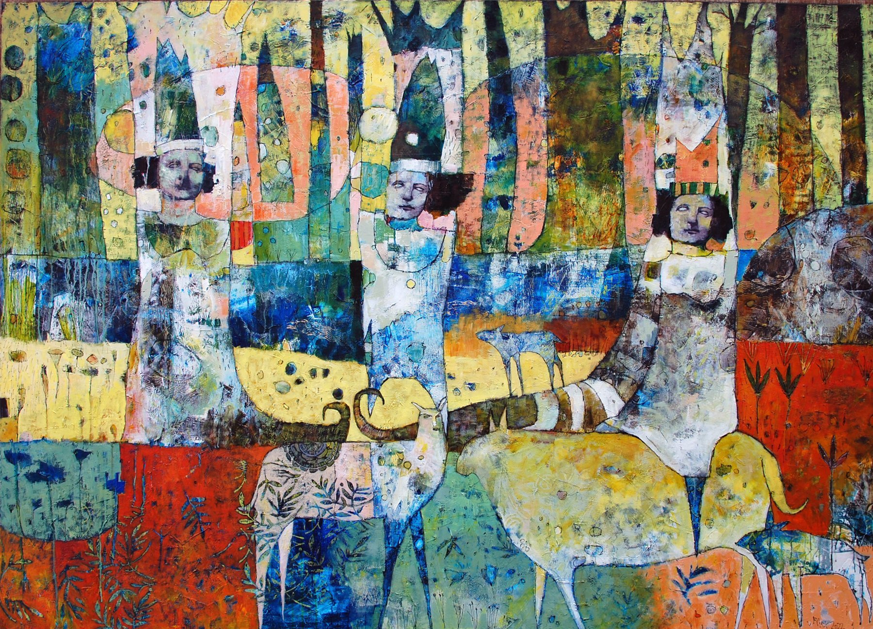 Jane Filer has a devout following of art collectors and friends who attend her solo exhibitions. Many of her shows include “Happenings”, a modern primitive drum dance of characters roaming the gallery during opening receptions of her latest work.