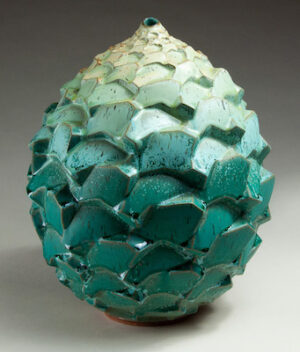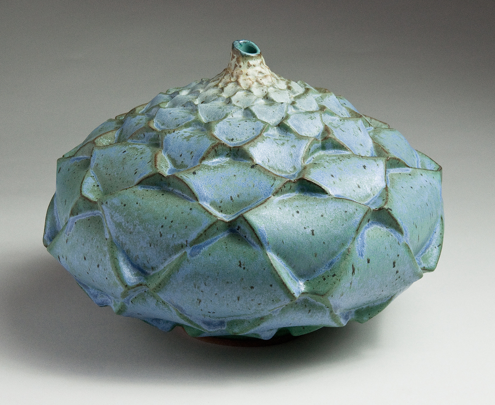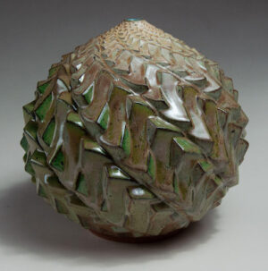 In the ancient world, vessels were used functionally, but also metaphorically in ritual and literature, employing some of the same ideas of interiority. Looking back to these antecedents, I treat the metaphor of the inner as a resonant subject matter for non-functional ceramic art pieces. Implied are the dichotomies between the inner and outer, the hidden and the seen, the created world and the ineffable mystery. Cutting through the wall and changing the angles of the various connecting planes in my complex tessellated patterns, I create deep relief, a dynamic movement that leads the eye to the inside of the vessel, opening a dialogue between the vessel’s outer planes and inner spaces.