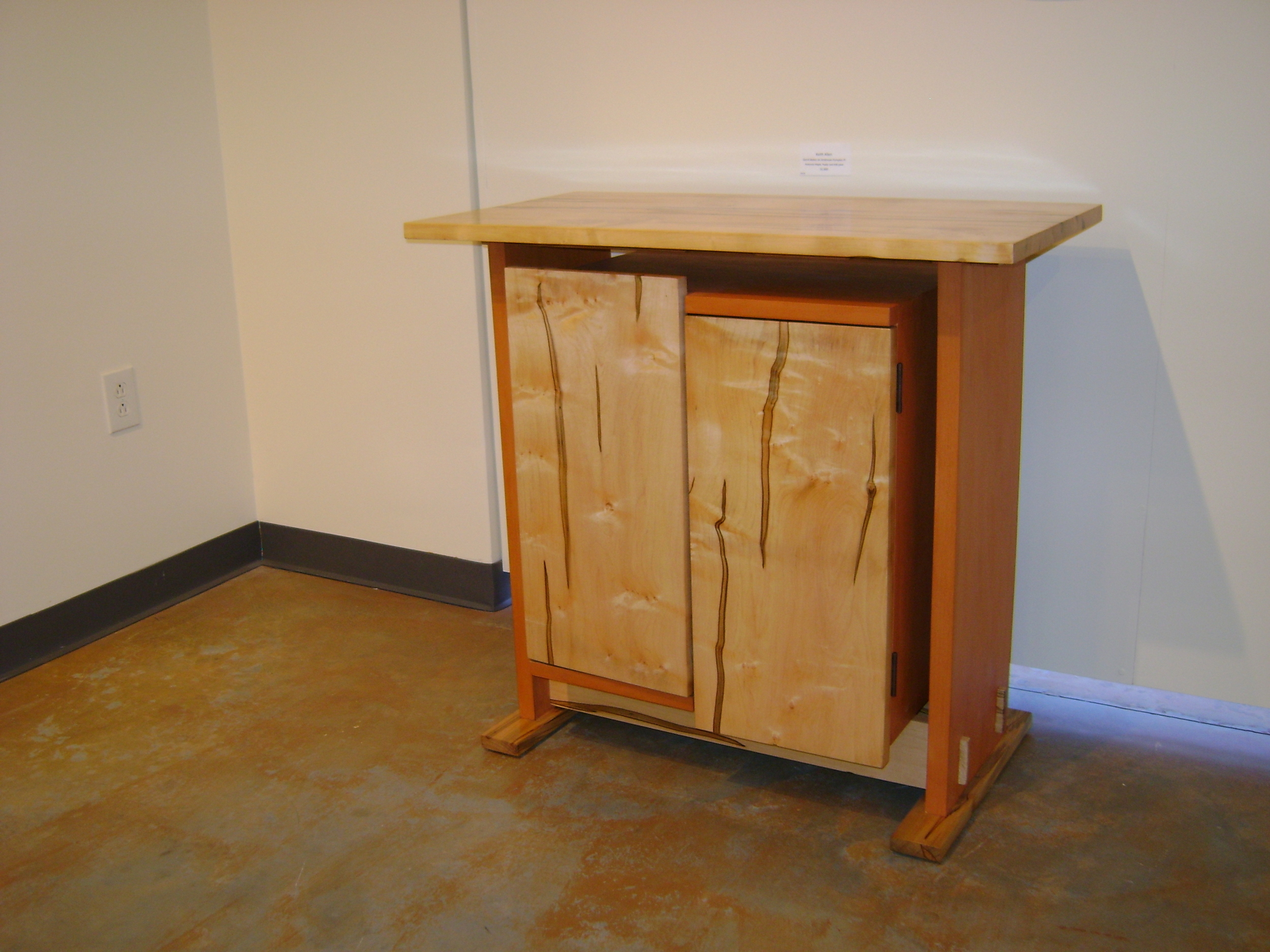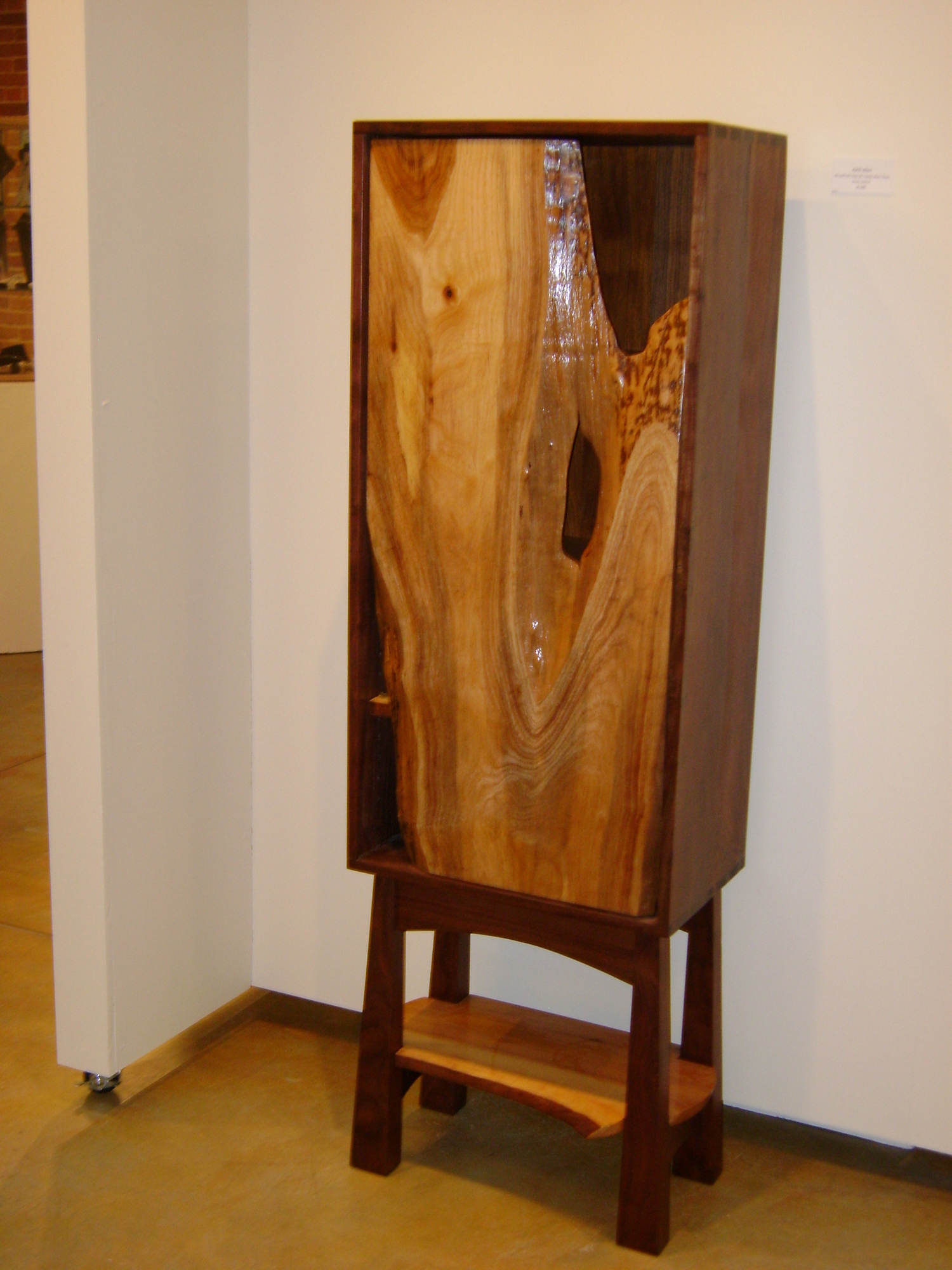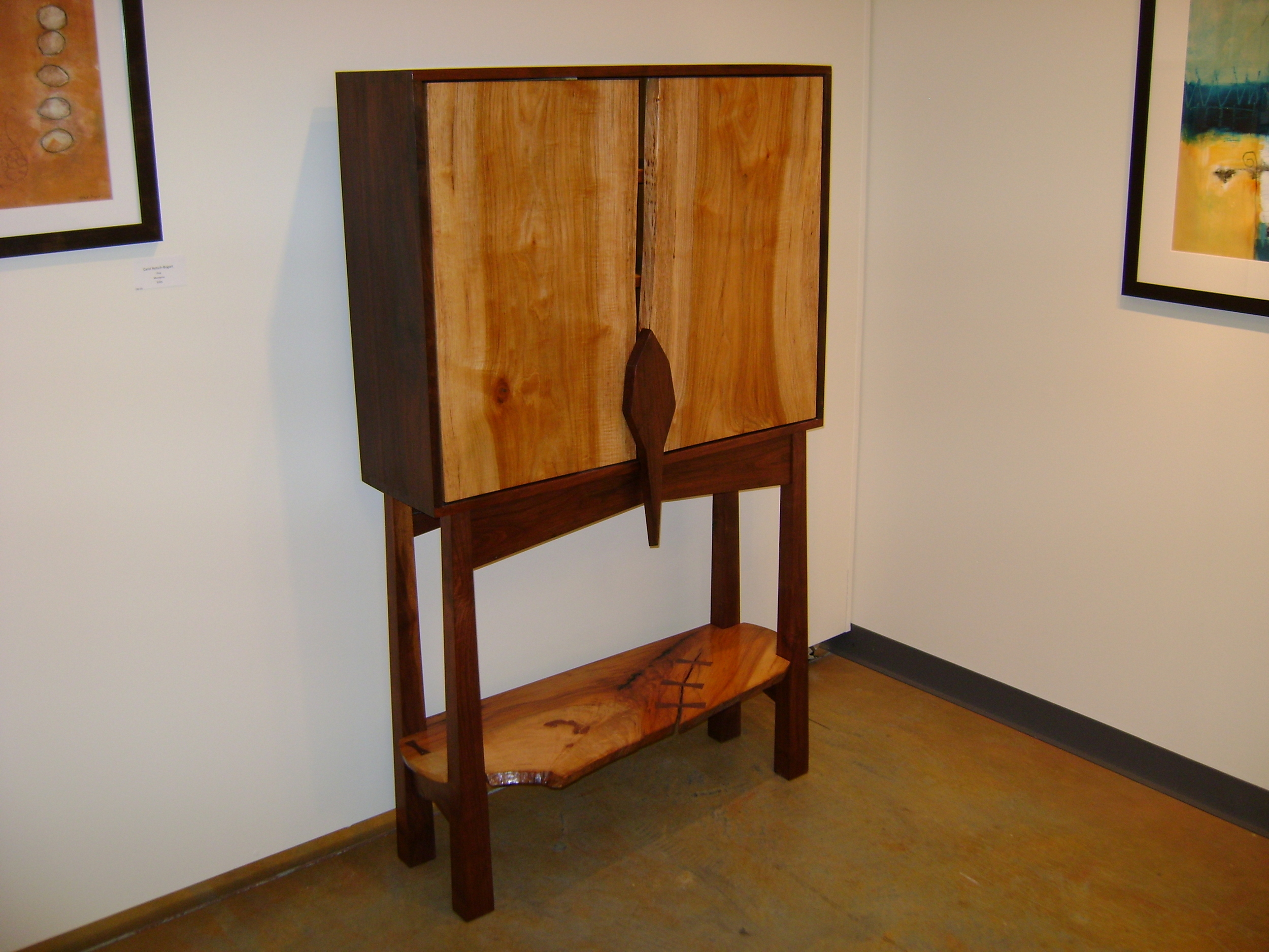 I seldom rely on drawings, other than a quick, rough sketch. I prefer to use my eyes for understanding relationships and details as a design evolves. Geometry plays a strong role, perhaps hearkening back to earlier careers in math and computer science. My pieces are functional, but I concentrate on form, and let the eventual user decide particulars of how, or where, to use a piece. I sometime juxtapose rustic natural details and stark geometry in the same piece. Asymmetry and open space are common features, as are contrasting woods and colors. Technically, my work is largely traditional. I employ hand-cut dovetails, mortise-and-tenon joinery, and a hand finish using a variety of oils, varnishes, waxes, dyes, and milk paint.
