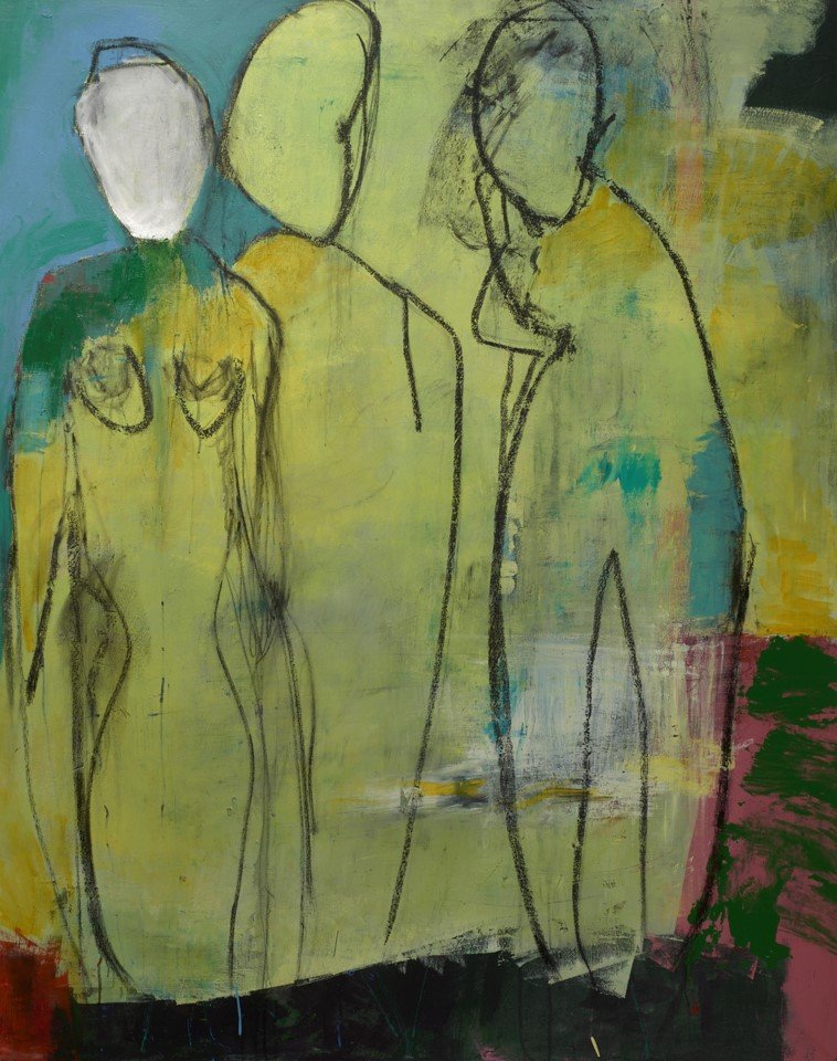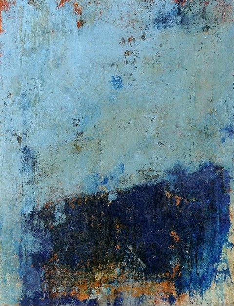 The mystery of abstraction speaks to me. Without thought as to the outcome, my oil and acrylic paintings on canvas, paper, and wood board begin with mark-making then evolve into what I call a “conclusion.” For me, there is a great anticipation throughout the process as I watch the work developing, turning, and arriving at places and ideas, much like the way a conversation does. I start with mark-making that often includes symbols, words, and phrases, then apply bold color and texture. I most enjoy working on hard boards which allow me, without inhibition, to gouge, excise, and dig into the paint layers which are often created with materials such as pastes, coffee, and dirt. With these materials I can build the surface and create the foundation for even more experimentation.