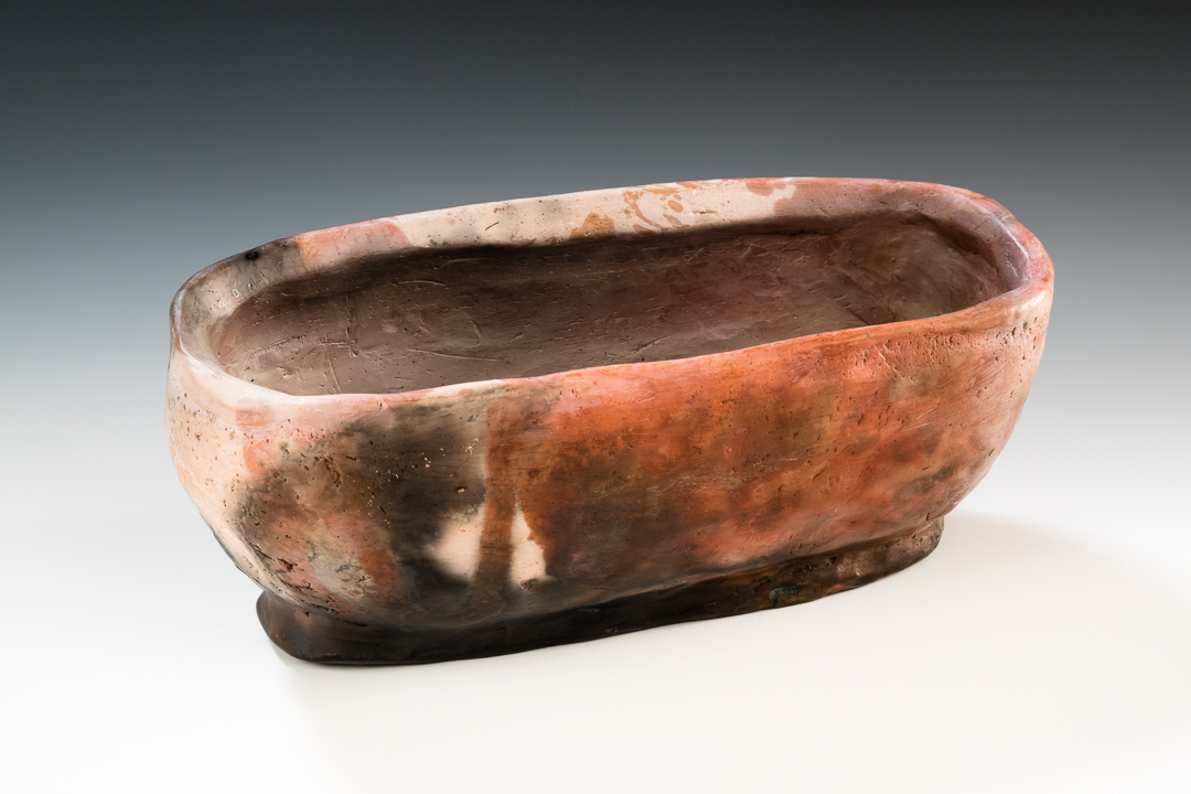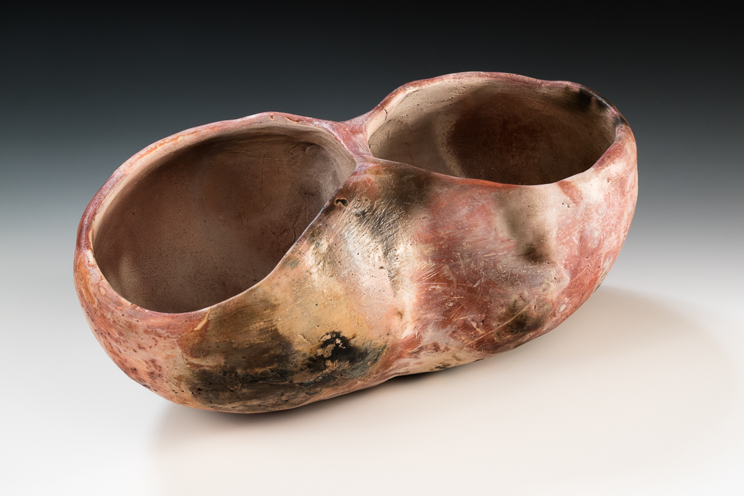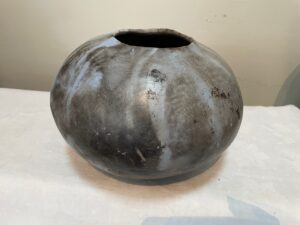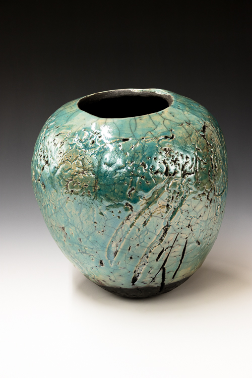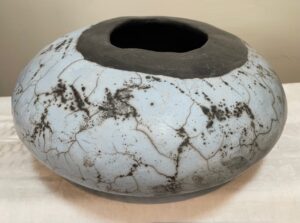My finishing process includes burnishing, bisque firing the vessels in an electric kiln and then either fire them in a pit or a raku kiln, both variations of what’s known as smoke firing. Smoke firings are unpredictable, spontaneous and intriguing. Not for anyone needing a sense of control!