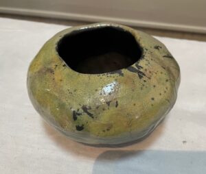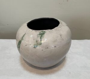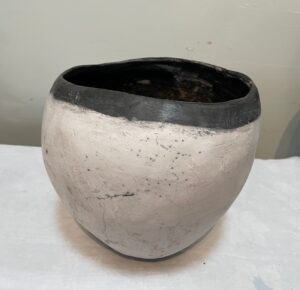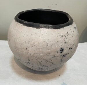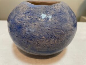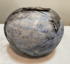 I have worked with clay for the past 40 years. Throughout these many years I have almost exclusively made hand built vessels using the “Pinch Pot” method. Using this method is meditative, allowing me to relax with the clay, interact with it, forming a relationship which is not always consciously developed. I enjoy the slowness of this process. When I make vessels, especially the larger ones, I pay close attention to the feel of the clay, noticing closely it’s moisture, thin or thickness of the walls of the vessel. I work with one hand on the outside and the other on the inside of the vessel, pushing out from the inside and pressing in from the outside. Occasionally, if the wall of the vessel becomes too thin, a hole is created, which I work with so the vessel doesn’t become too weak in that area. I am clear that I do not ever give up on a vessel, if it looks like it’s falling apart, I fix it. Because making my vessels is a long process, I feel emotionally attached to them and sometimes find it hard to part with them.
