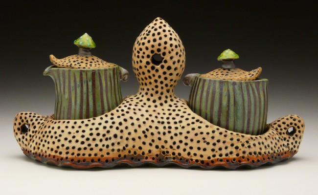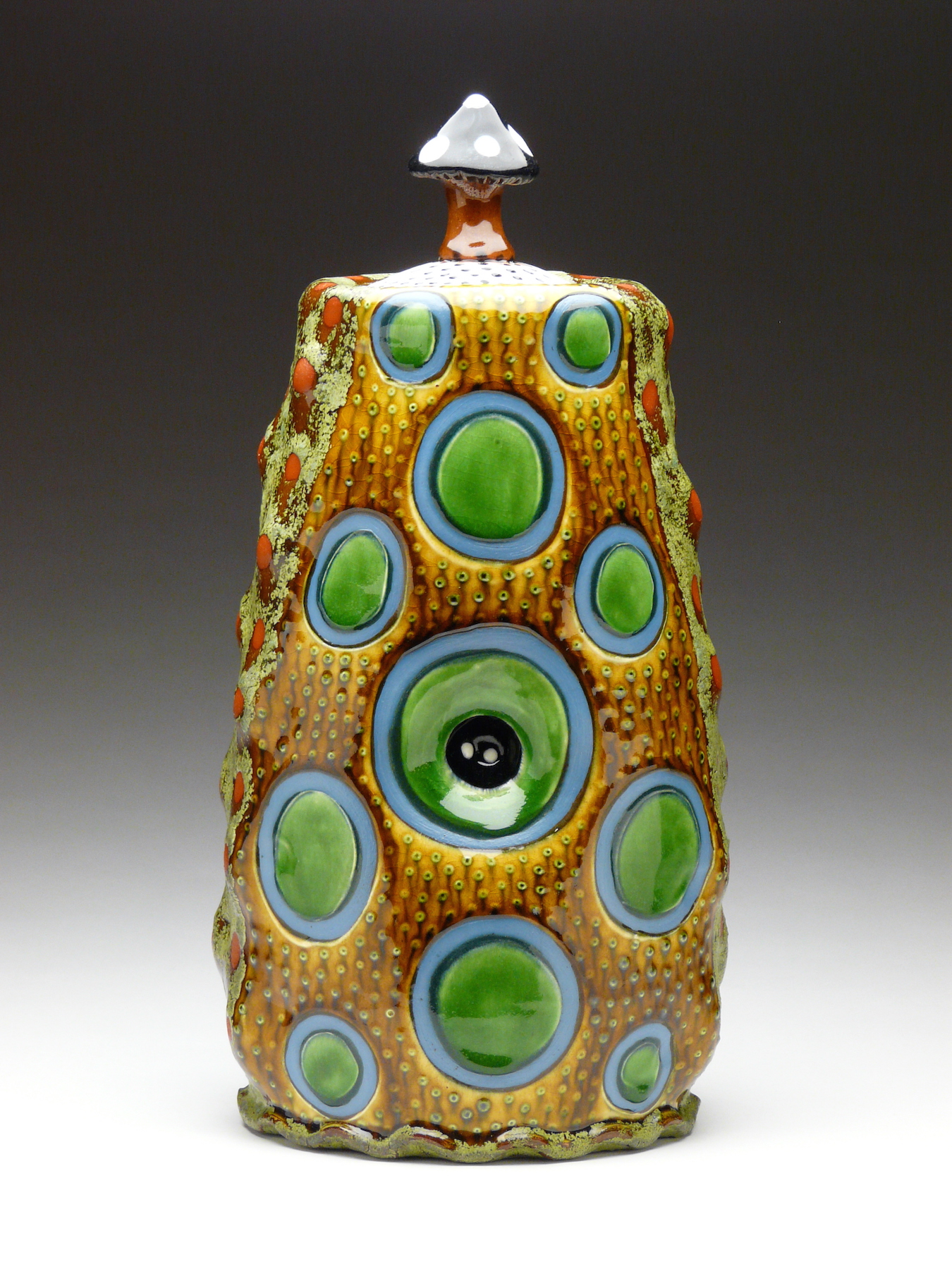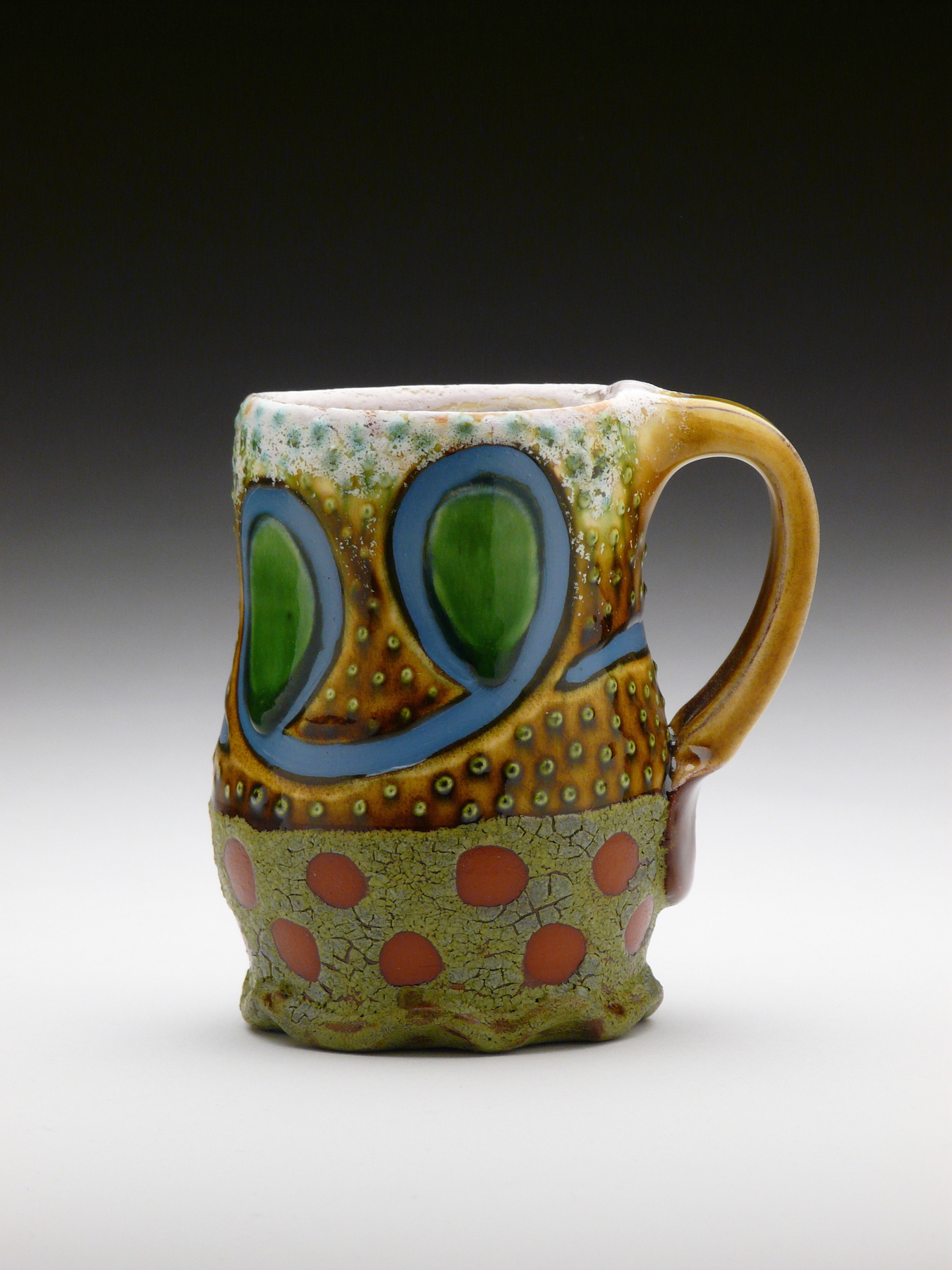 My ceramics are an amalgamation of the influences of my youth, the natural and the fantastical. My vessels provide a ceramic comic book interpretation of the natural world and its processes of growth and decay. I use thick line contours, a fullness of volume, and areas of exaggerated detail to embellish my functional ceramic vessels. I translate and abstract budding leaves and lichen encrusted bark, and assemble a collage of interpretations of natural phenomena. I like to take bits and parts, magnifying some, diminishing others and assemble them into a vessel worthy of use and destined for contemplation. Through my ceramic objects, I hope to relay a narrative of the natural world, focusing on the overwhelming visual and tactile information that seduces and causes me wonder.