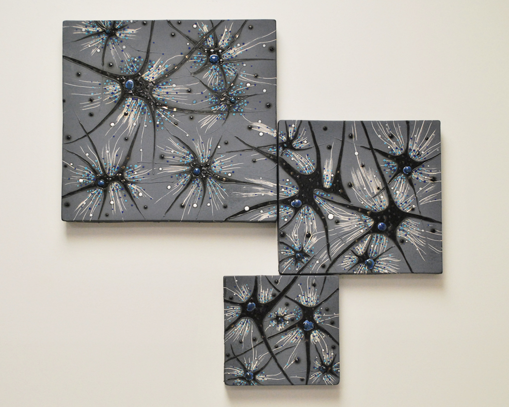 My inspiration comes from microscopic images of various cells and microorganisms as the basis of all life. I am intrigued by dichotomy between the enormous beauty of these images and the fears or repulsiveness that people often have when faced with viruses or bacteria. I love the idea of questioning our relationship with the world inside of us. In the same way as microorganisms are multiplying and spreading, so are my pieces. I find great excitement in making yet another similar but totally unique piece.