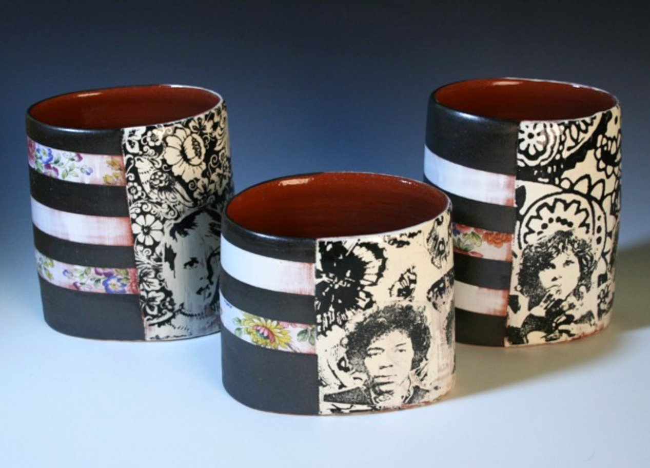 She utilizes many printmaking techniques to build the surfaces of her vessels. Digital technology plays an important role in her process – making her own iron decals, and transferring them onto the clay. Watching her grandmother sew her dresses, and quilt as a young child influenced her sense of craft and design. Most of the images she uses are rooted in 1960’s and 70’s pop-culture. Her work continually intertwines history and memory, and perpetuates her nostalgia of being a young girl growing up in the rural foothills on western North Carolina in the 1970’s.