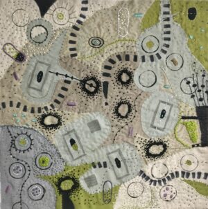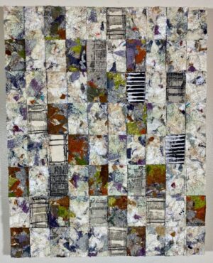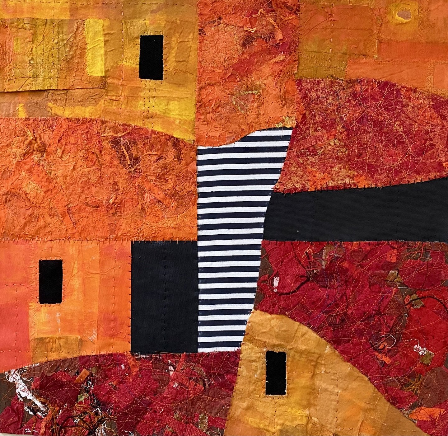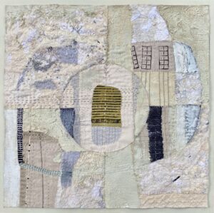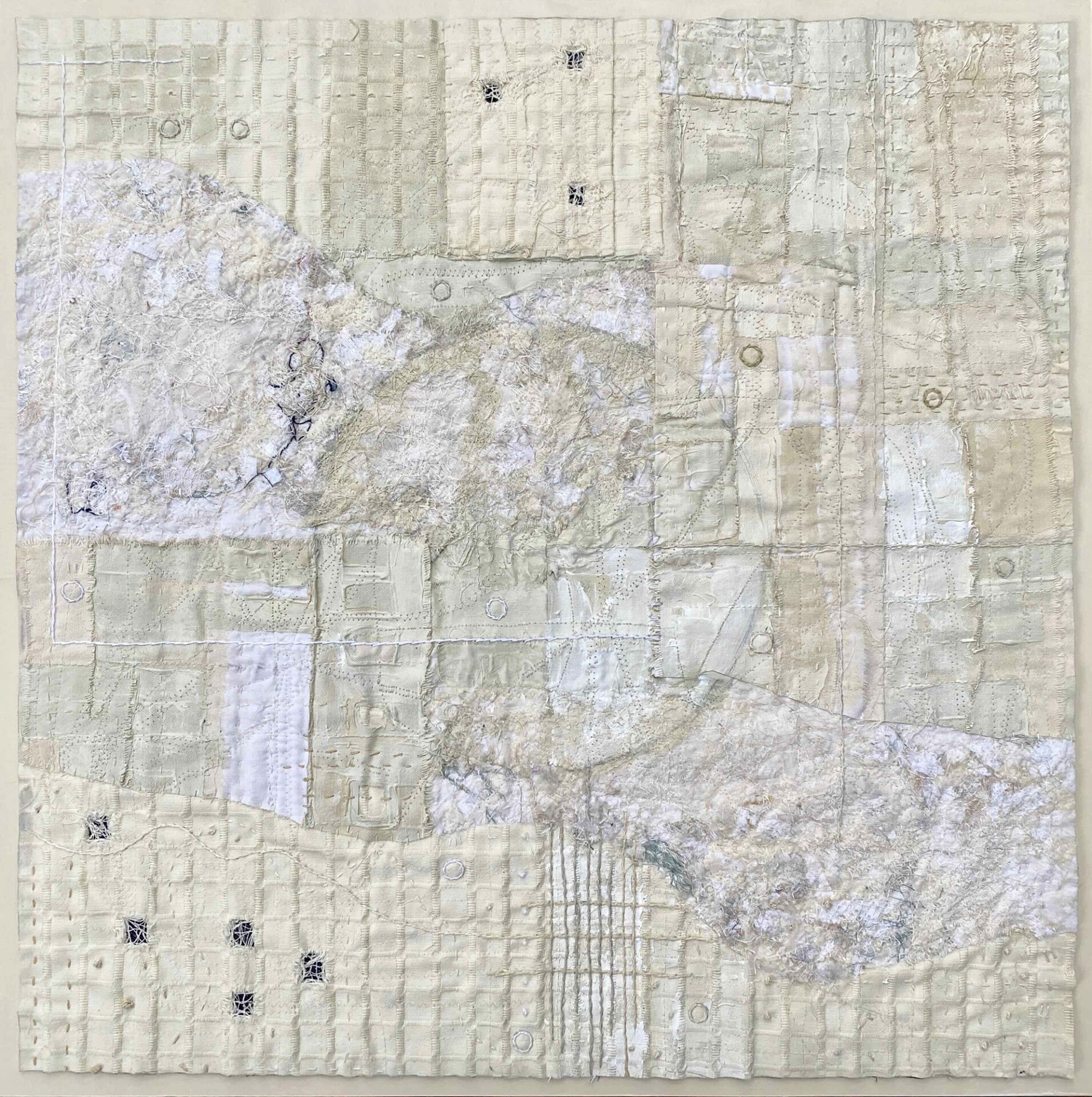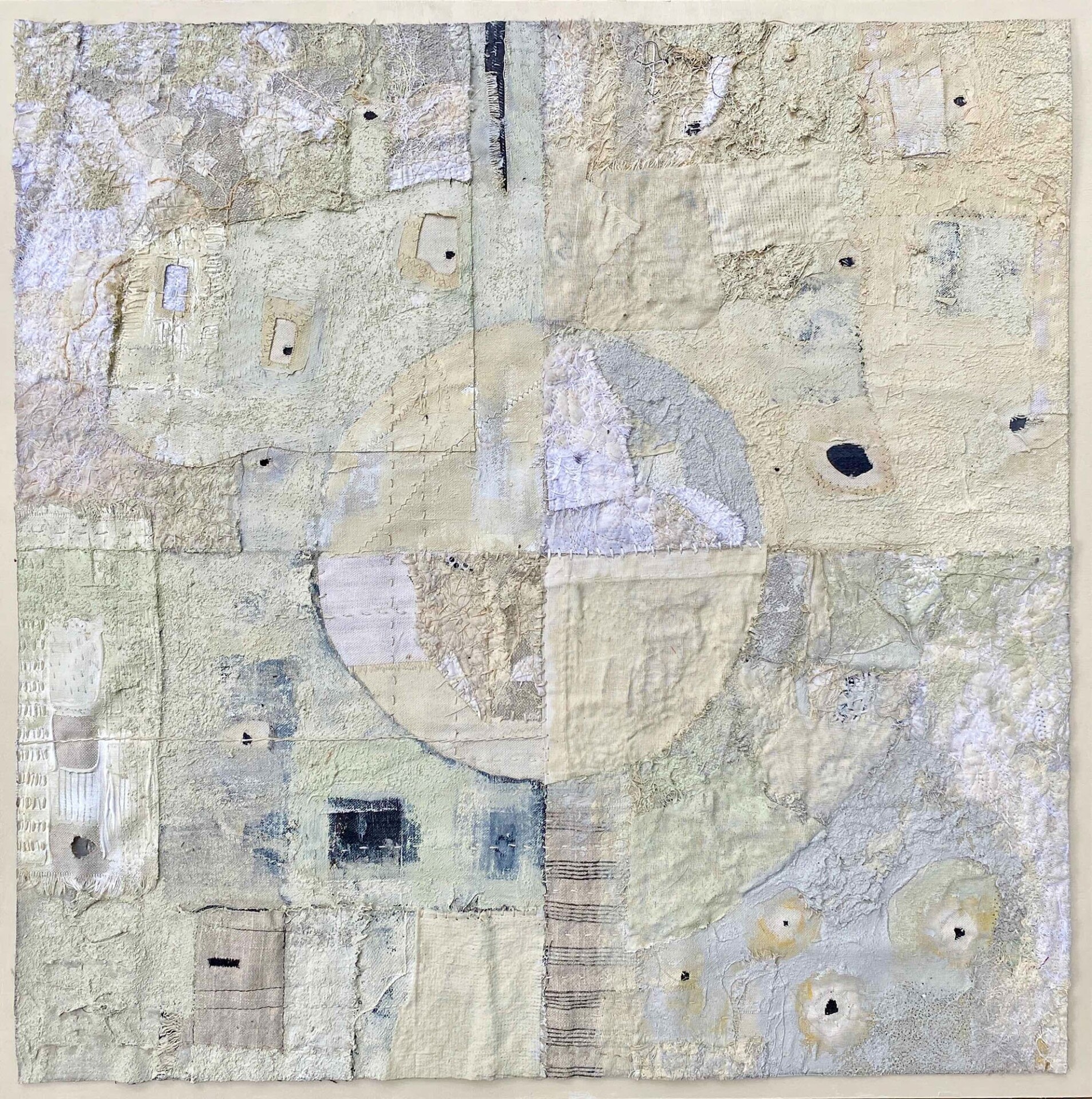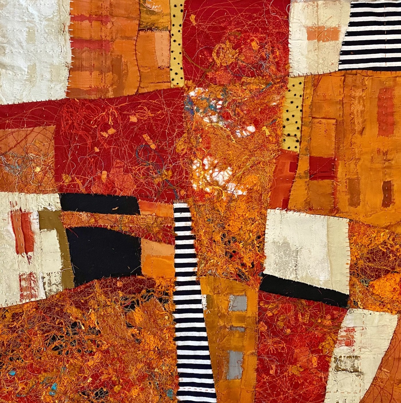 I create highly textured abstract pieces with new and reclaimed fabric, paper, and objects, thread, and acrylic paint. My work bears the imprints of the manipulation of my materials: the ripping, unraveling, and layering of fabric; the stitching and knotting of threads; the printing, dripping, and scraping of paint.