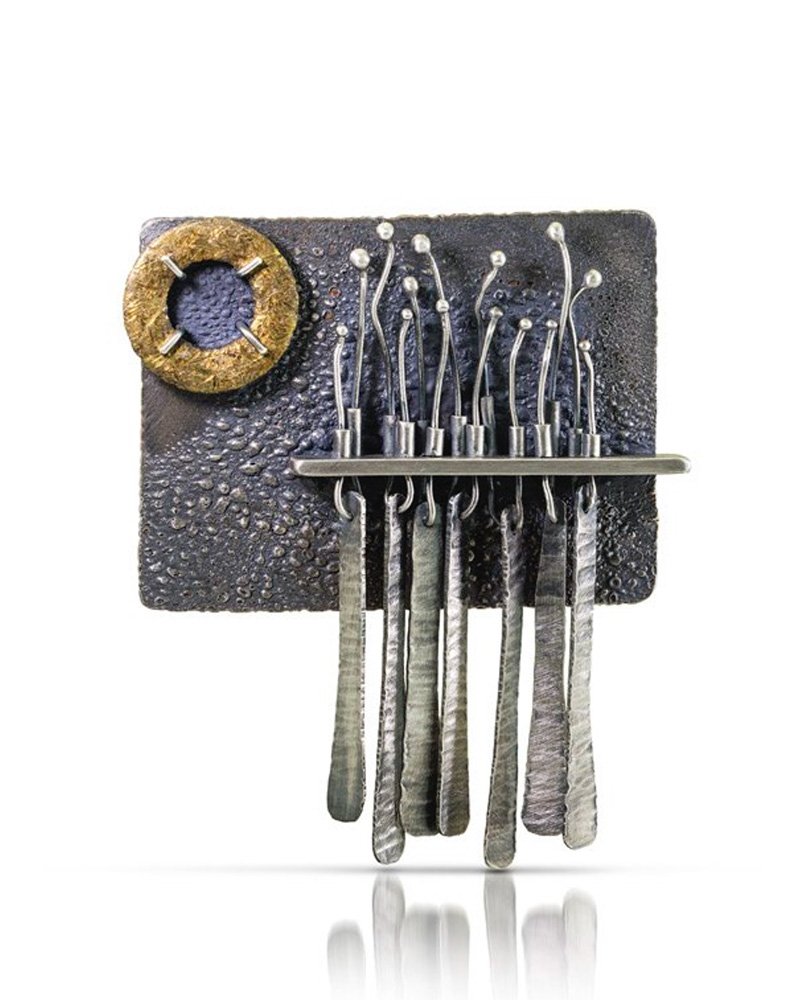 Some pieces are like growths and others like landscapes; and others are signs for wearer. I “peg” the little shapes of metal so that they lift above the back sheet or in their boxes; they look like they are floating. I let them bunch together or tease them apart to add tension. I create the surface textures on the shibuichi with my torch (reticulation) and on the other metals with hammers and the rolling mill.