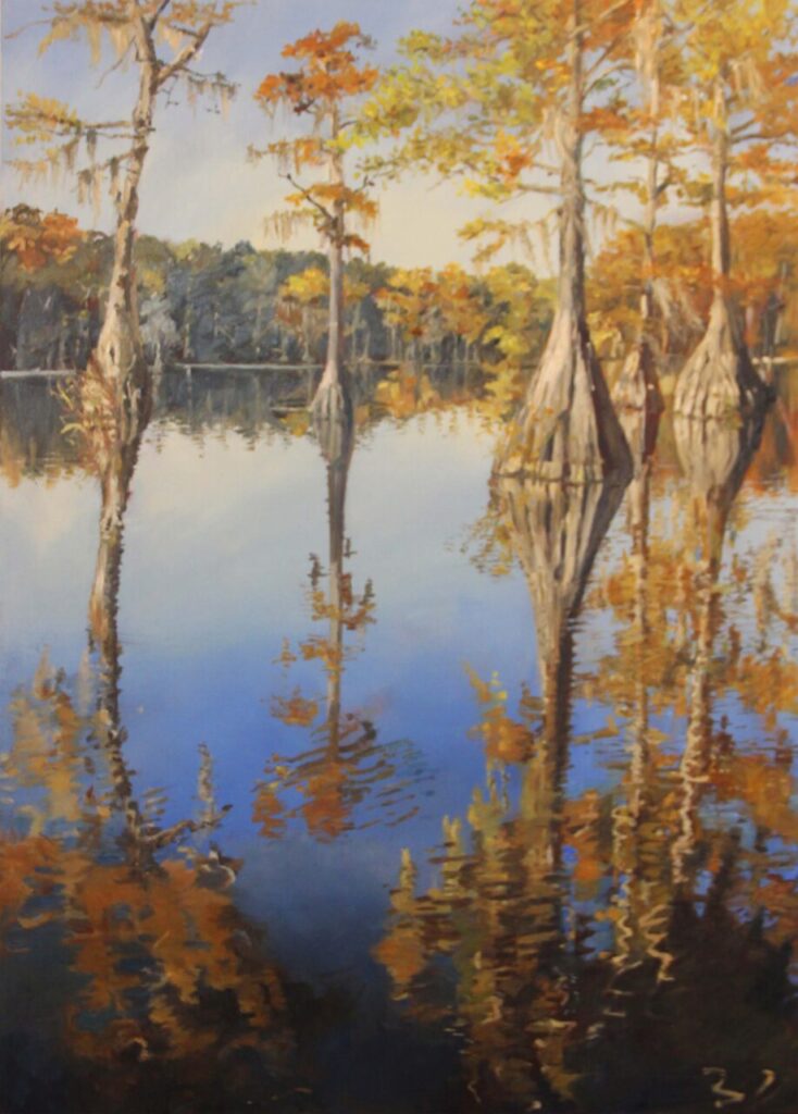The landscapes Carroll paints are places where she feels most alive, and many are tied to family roots in eastern North Carolina. She remembers creek fishing trips — first with her father and later with her son — as hours of contentment with bursts of excitement thrown in. Carroll’s oil paintings convey the physical and emotional essences of these specific places.