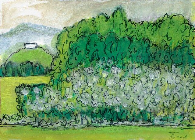 Nerys’ work is inspired by her summer travel sketches in Great Britain and northern Italy. She then captures the energy of those sketches in paintings with bold lines and strong colors. The works in this exhibit show how, with simplicity of form and line, Nerys effortlessly conveys the mood and dimensionality of place.