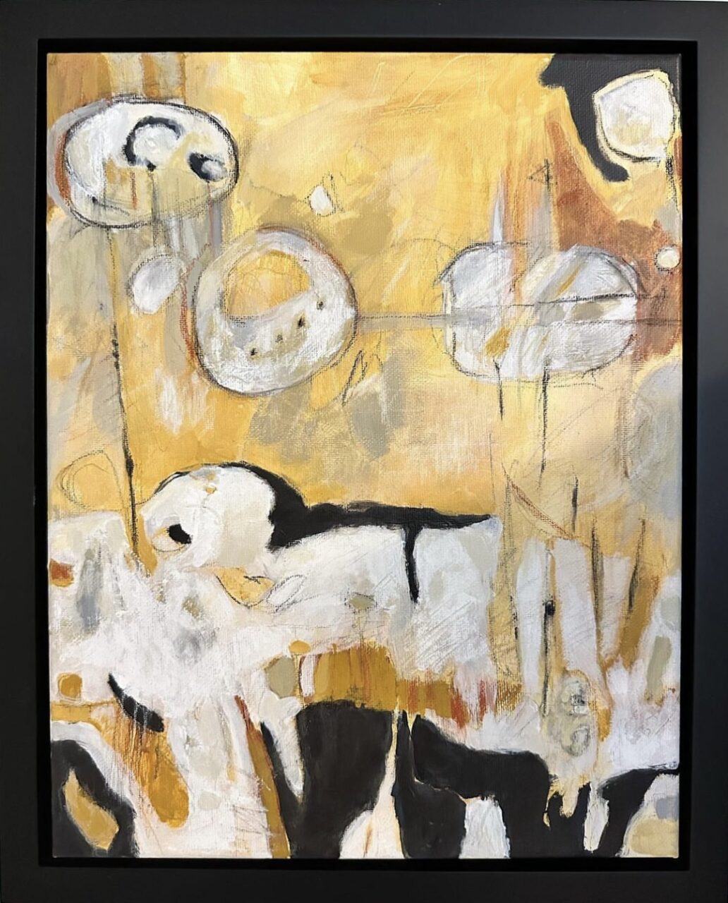 Abstract painting in ochres, black and white. Black frame