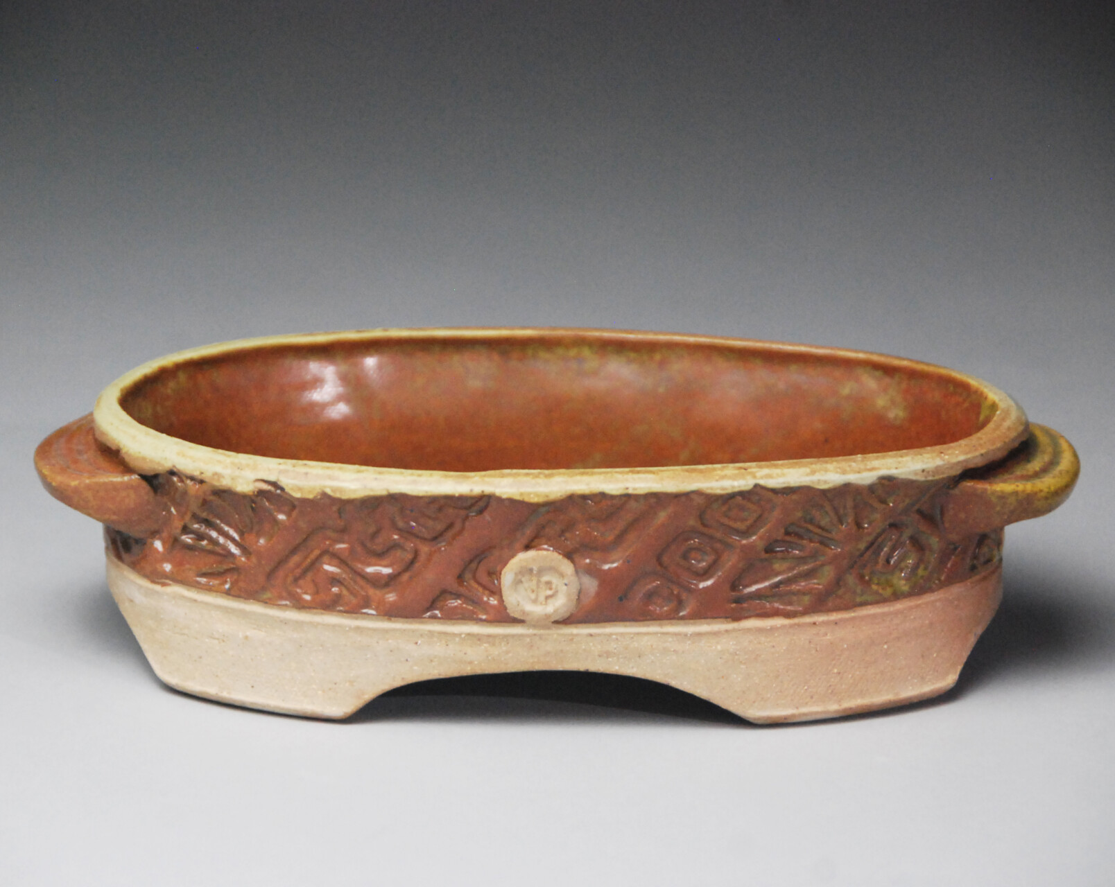 Slab-built stoneware clay, impressed with bisque-stamps that I carve, soda-fired to cone-7