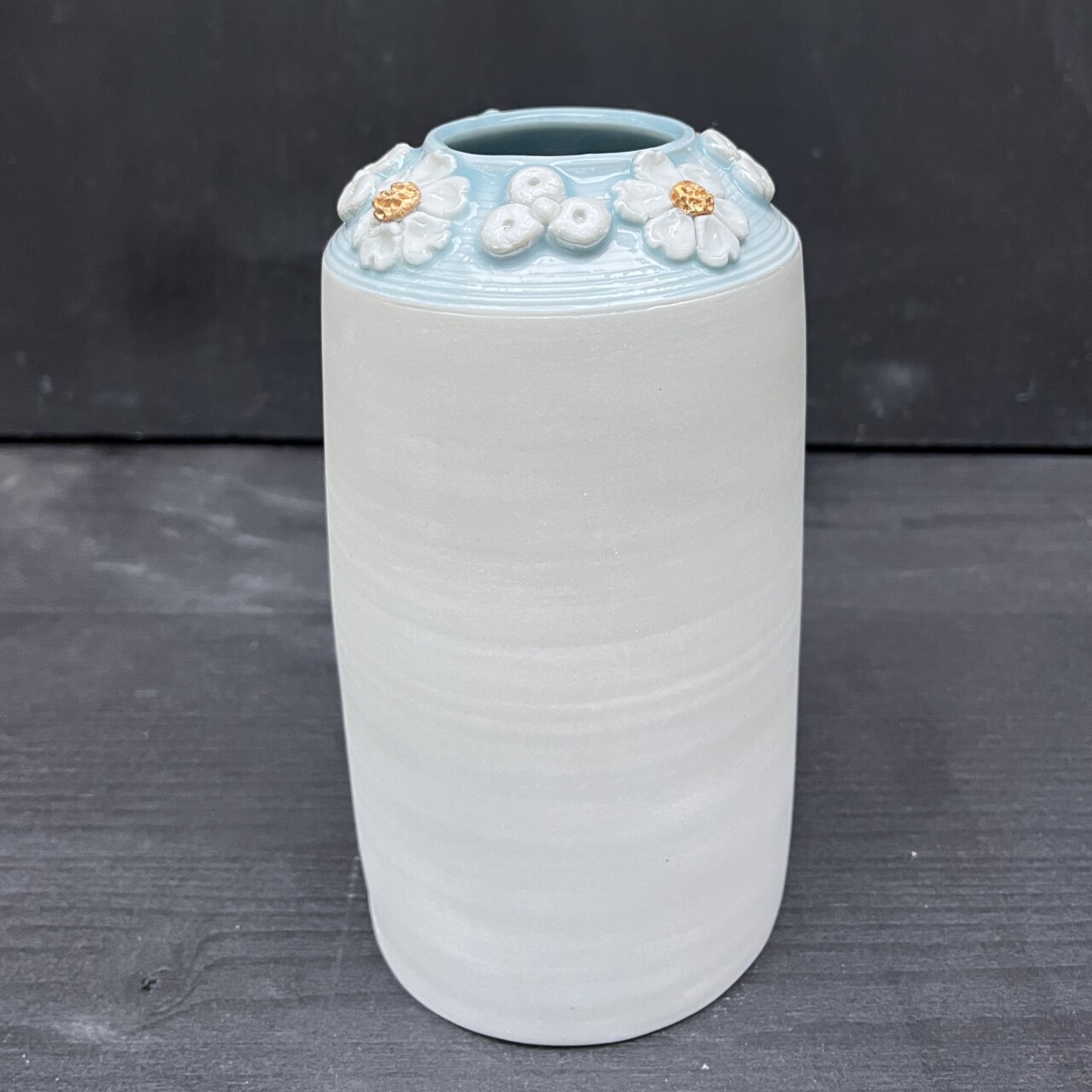 Wheel thrown and altered porcelain, celadon glaze, cone 10 gas reduction; gold and mother of pearl luster, multiple cone 017 electric firing.