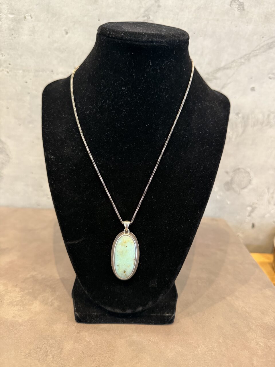 Oval chrysoprase cabochon set in sterling silver pendant with oxidized extended backplate. Oxidized sterling silver chain.