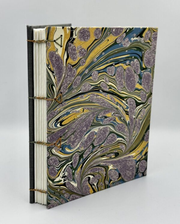 front cover and pastedown: Jemma Lewis hand-marbled paper; back cover Cialux book cloth; text block: Arches Text Wove White