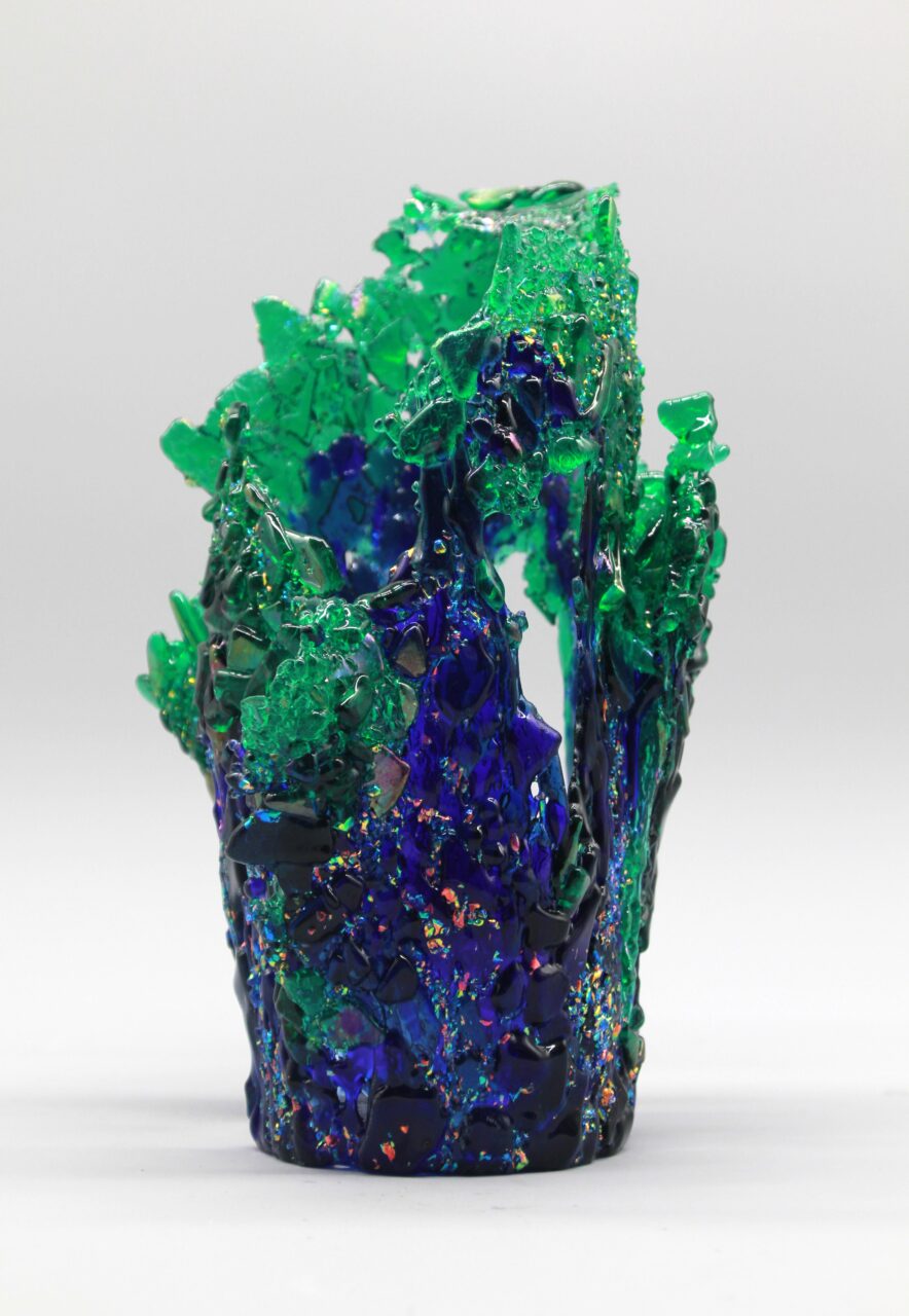 Glass sculpture designed to blend the natural properties of a rough Azurite gemstone with the brilliance of its prismatic crystals. Crafted with hand-cut and crushed glass fragments, sifted and layered in varying densities, and free formed to create its granular texture and fluid shape. Kiln fired through multiple heating and cooling cycles, and cold worked to its completion.