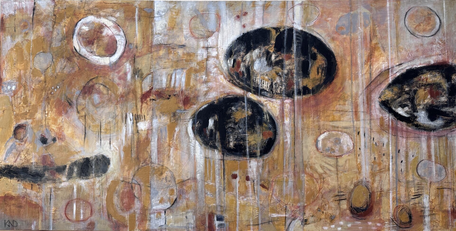Acrylic mixed media. Neutral colors with 3 black floating orbs.