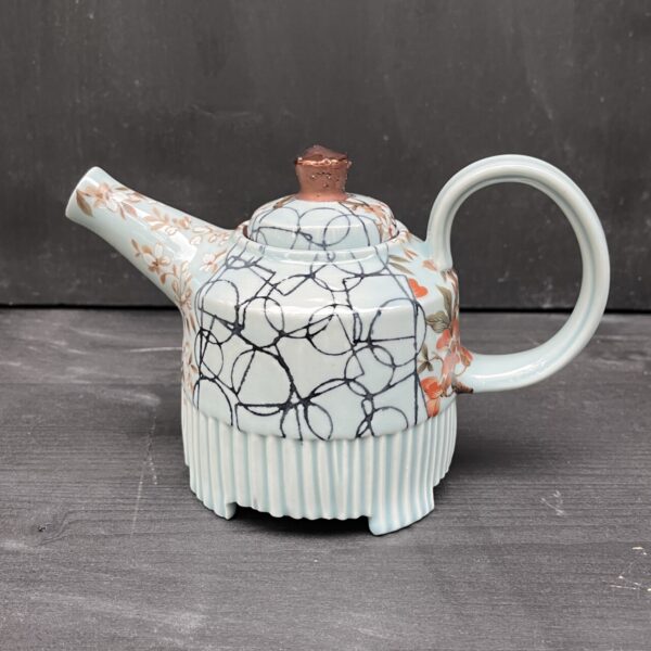 Wheel thrown and altered porcelain, underglaze, celadon glaze, cone 10 gas reduction; Decals, luster, multiple cone 017 electric firing.