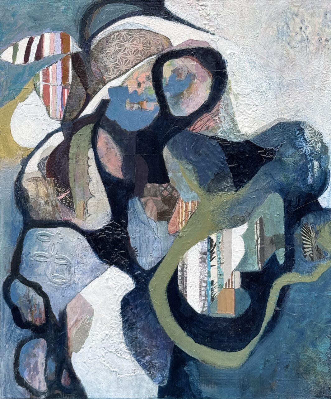Acrylic paint, paper collage, plastic netting, photo image transfer, tissue paper, photographs, charcoal and graphite on linen