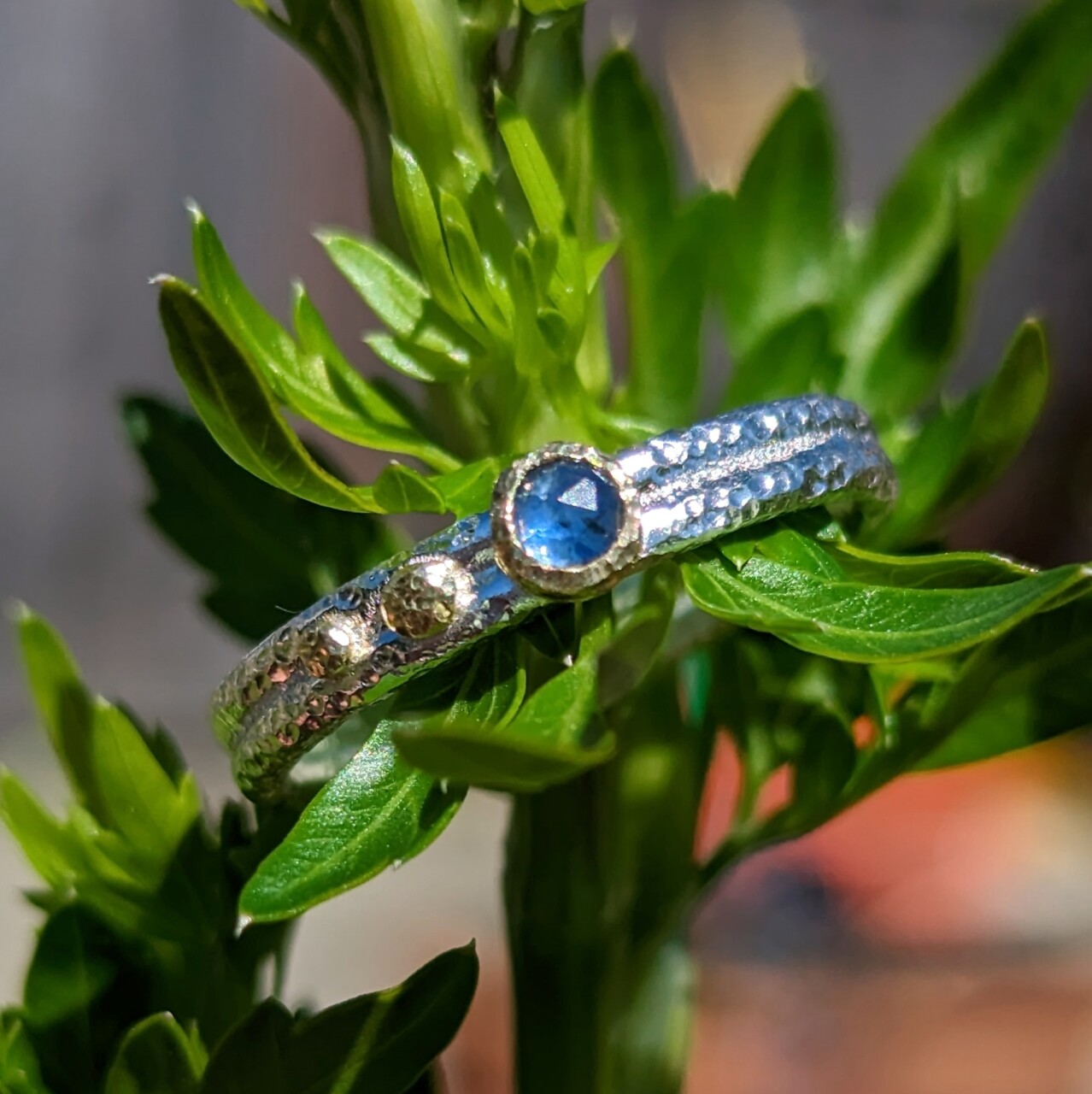 These rings are created almost entirely without solder! After making 2 identical argentium silver bands, I fuse them together, then fuse solid 18K gold accents to the surface. The ethically sourced 3mm gemstone is then carefully fit into the handmade setting before hand hammering it in as well as the tiny texture. Fusing created super strong bonds with clean joins as well as a gorgeous subtle molten metal texture. It also activates the tarnish resistant qualities of argentium silver, creating a bright white layer of natural tarnish resistance on the surface. Each ring is unique, with the details created by the making process.