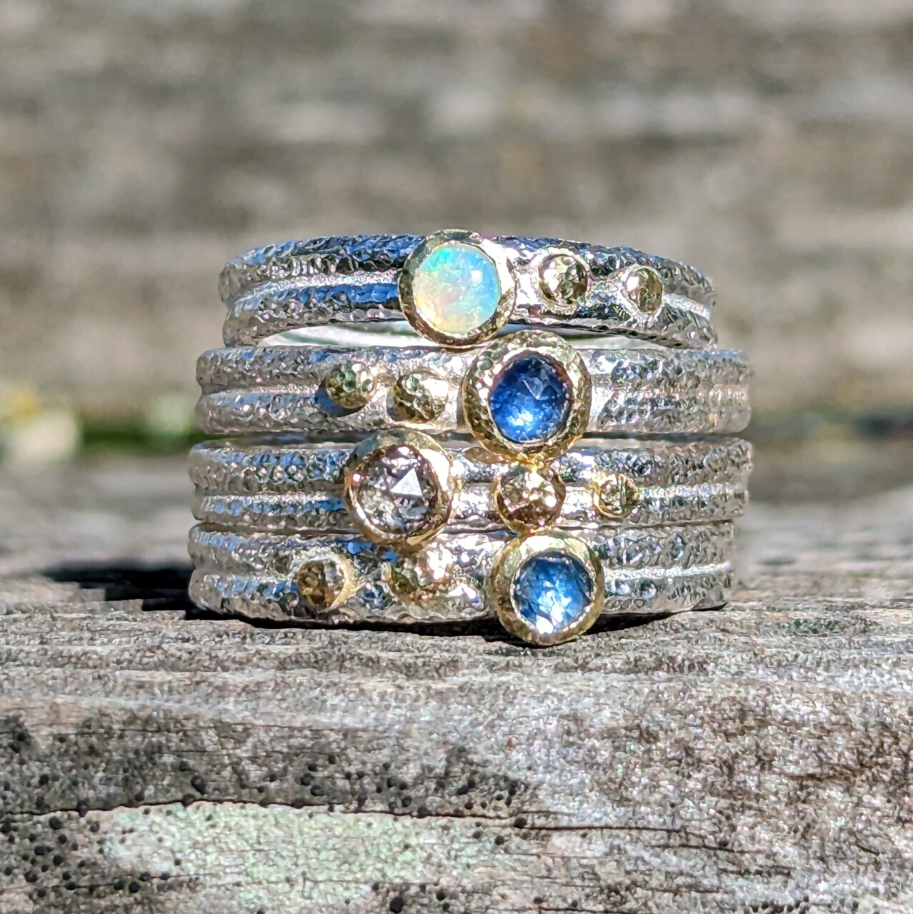 These rings are created almost entirely without solder! After making 2 identical argentium silver bands, I fuse them together, then fuse solid 18K gold accents to the surface. The ethically sourced 3mm gemstone is then carefully fit into the handmade setting before hand hammering it in as well as the tiny texture. Fusing created super strong bonds with clean joins as well as a gorgeous subtle molten metal texture. It also activates the tarnish resistant qualities of argentium silver, creating a bright white layer of natural tarnish resistance on the surface. Each ring is unique, with the details created by the making process.