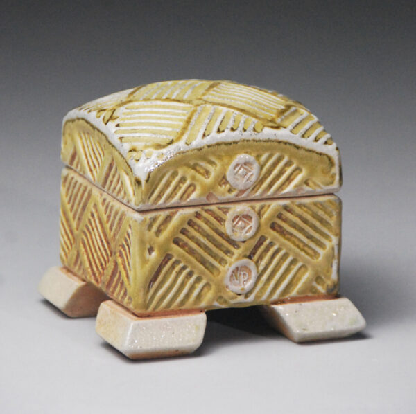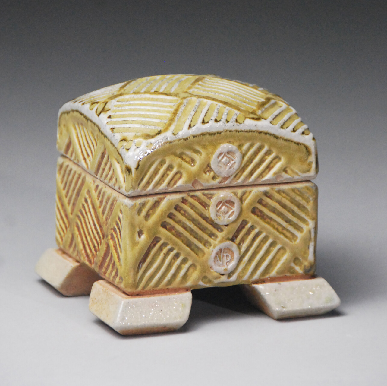 Slab-built stoneware clay, impressed with bisque-stamps that I carve, soda-fired to cone-7