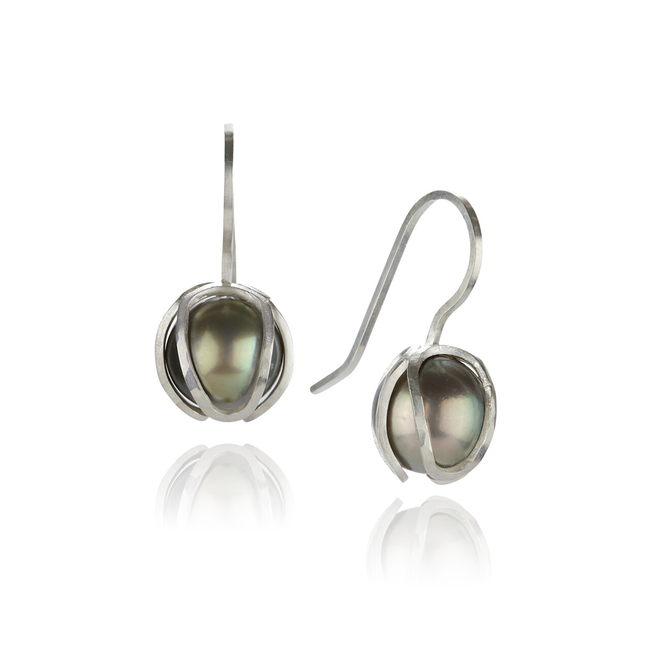 Lustrous round grey Tahitian pearls are captured within a geometric flower bud. Entirely hand fabricated out of Argentium Silver, these are built to last with minimal care. Natural round AAA grey Tahitian pearls