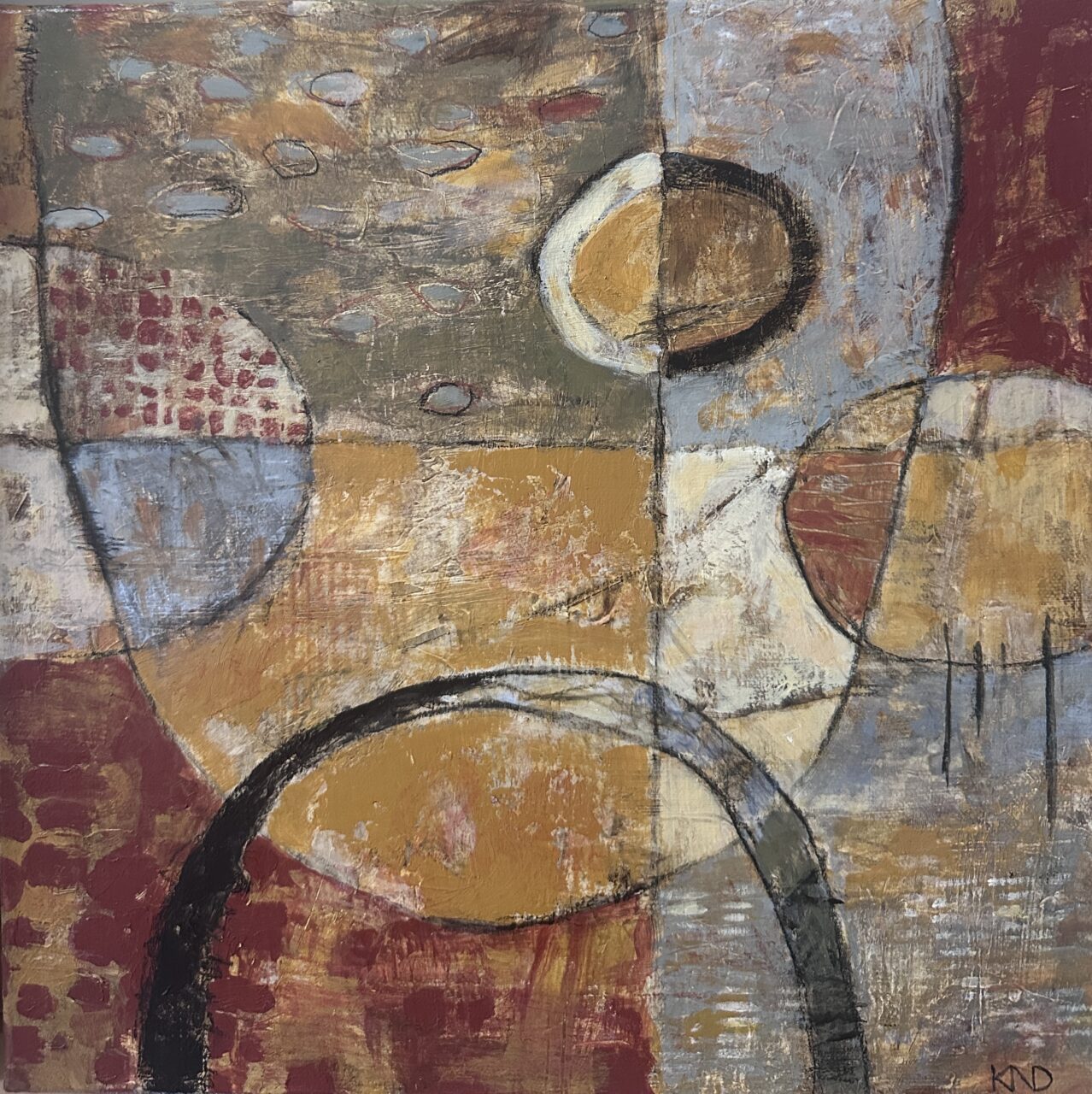 Square acrylic painting with intersected circular forms. Neutral colors