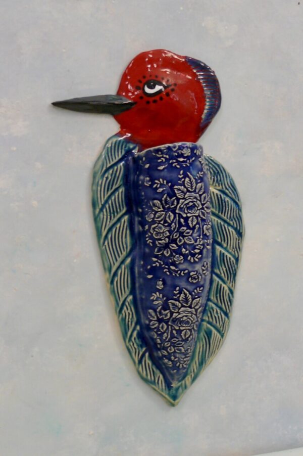 Handmade porcelain woodpecker wall pocket vase by Cathy Kiffney